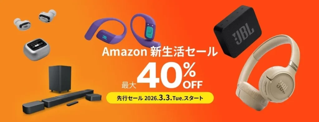 2026年3月3日から9日まで開催されたAmazon新生活セールでは、世界的なオーディオブランドJBLのワイヤレスイヤホン、ポータブルスピーカー、サウンドバーなどの人気モデルが最大40%オフで提供されました。ハイクオリティなサウンドを手軽に体験できるチャンスとして注目を集めました。 -