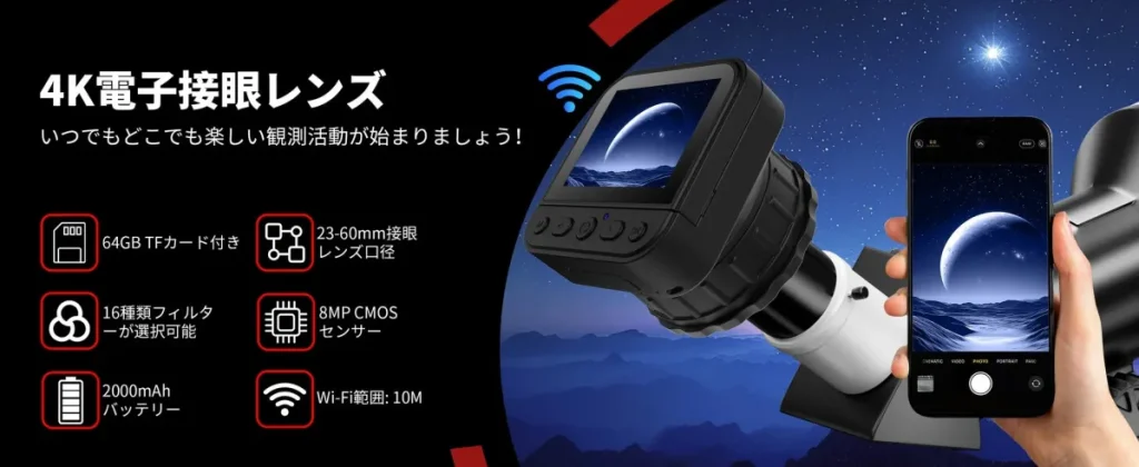 Telonixium 4K WiFi望遠鏡カメラは、スマートフォンを高性能な記録コントローラーに変え、天体や野鳥の観察と記録の楽しみ方を根本から進化させるデバイスです。本記事では、本製品の主な特徴と、どのようなシーンで活用できるのかを詳しく解説します。 -