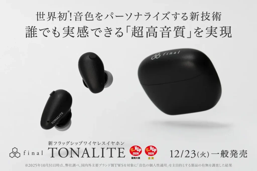 株式会社finalから、世界初の音色パーソナライズ技術「DTAS」を搭載したフラッグシップワイヤレスイヤホン「TONALITE(トナリテ)」が2025年12月23日に一般発売されます。本記事では、TONALITEの主な特長や機能、購入を検討する際のポイントを詳しく解説します。 -