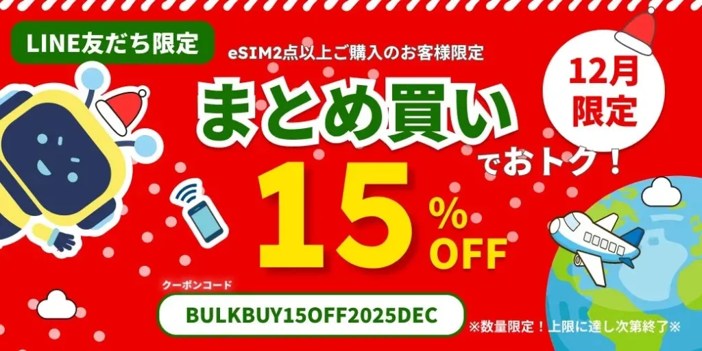 速報JAPAN株式会社が運営するeSIMブランド「DeSiM」は、年末年始の旅行シーズンに合わせたお得な「12月限定クリスマス&年末まとめ買いセール」を実施します。LINE友だち限定で、eSIMを2点以上購入すると合計金額から15%割引されるこの機会に、海外旅行や帰省の通信準備を検討してみてはいかがでしょうか。 -