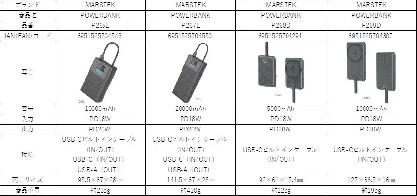 ハート電機サービス株式会社は、日本と中国の二重安全基準認証(PSE/CCC)を取得し、急速充電(PD20W)に対応したモバイルバッテリー「MARSTEK POWER BANK」シリーズ4アイテムを2025年12月15日に発売します。過電流・過電圧など6つの保護回路を搭載し、ビルトインケーブルで使いやすさも両立しています。 -