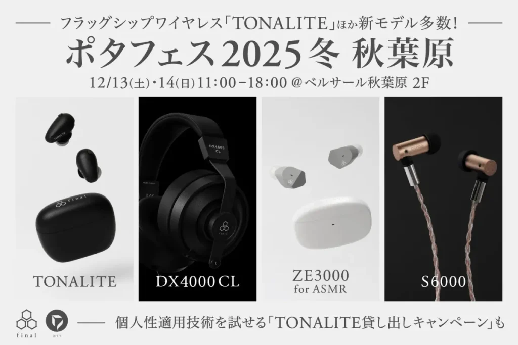 国内オーディオメーカーfinalが、2025年12月13日・14日に開催される「ポタフェス2025冬 秋葉原」に出展します。フラッグシップワイヤレスイヤホン「TONALITE」をはじめ、最新の密閉型ヘッドホン「DX4000 CL」など多数の新製品が登場。イベントの詳細と注目の製品ラインナップ、試聴キャンペーンについて解説します。 -