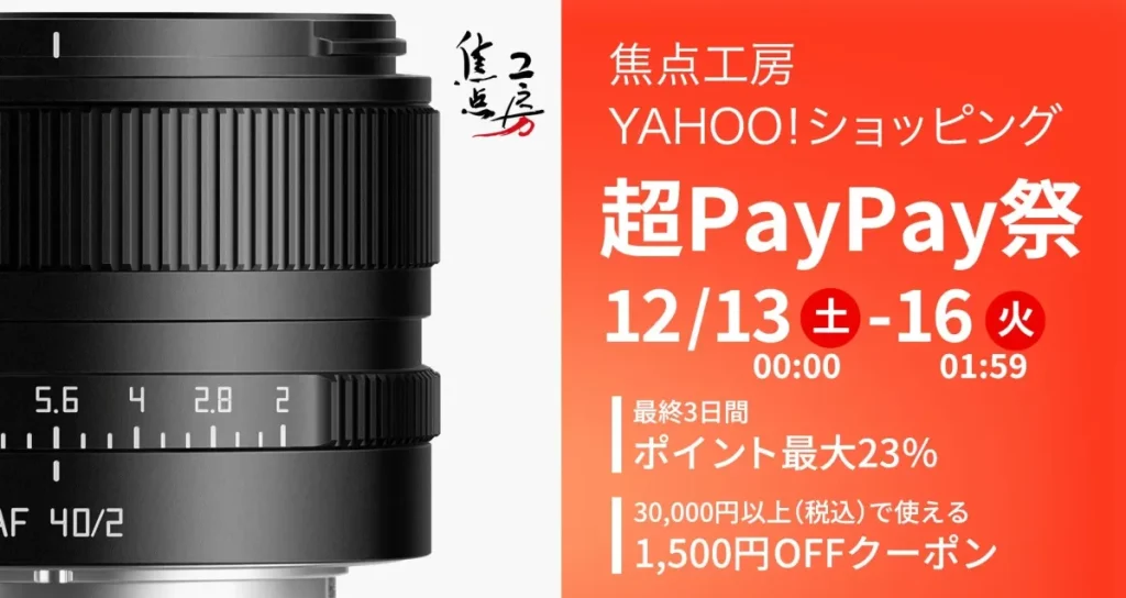 焦点工房Yahoo!ショッピング店が、2025年12月13日(土) 00:00から12月16日(火) 01:59までの「超PayPay祭」最終3日間において、最大23%のポイント還元と、税込30,000円以上の購入で利用できる1,500円OFFクーポンを提供します。この期間中、焦点工房が取り扱う人気レンズやマウントアダプター、アクセサリーがお得に購入可能です。 -