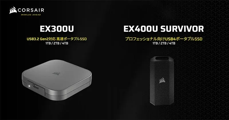 CORSAIR、USB Type-C接続の高速外付けSSD「EX400U SURVIVOR」と「EX300U」シリーズを発表