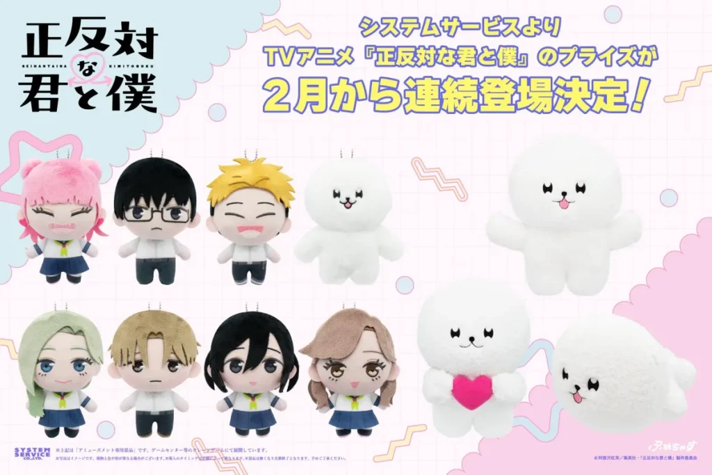システムサービスは、TVアニメ『正反対な君と僕』のプライズ商品を2026年2月より順次アミューズメント施設にて展開すると発表しました。作中のキャラクターを可愛くデフォルメした「ぷれちゃすぬいぐるみ」シリーズや、存在感のある「ぬいぐるみBIG イエティ」が登場。さらに、プライズ登場を記念したリポストキャンペーンも実施されます。 -
