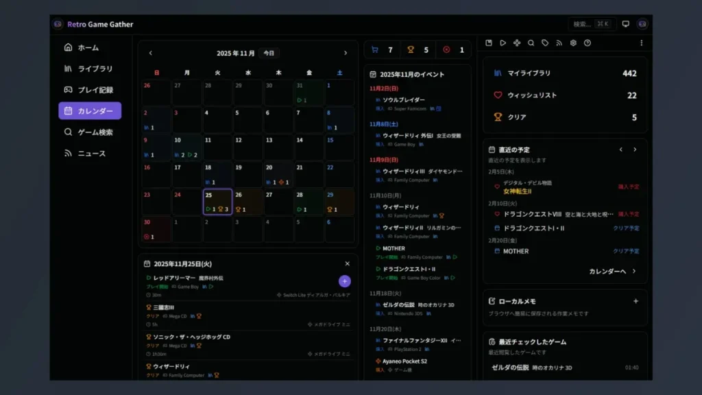 レトロゲームコレクション管理サービス「Retro Game Gather」がv1.2へ大型アップデート。カレンダー機能でゲームの思い出を時系列で記録し、グローバルサーチやUI改善でより快適なゲームライフをサポートします。 -