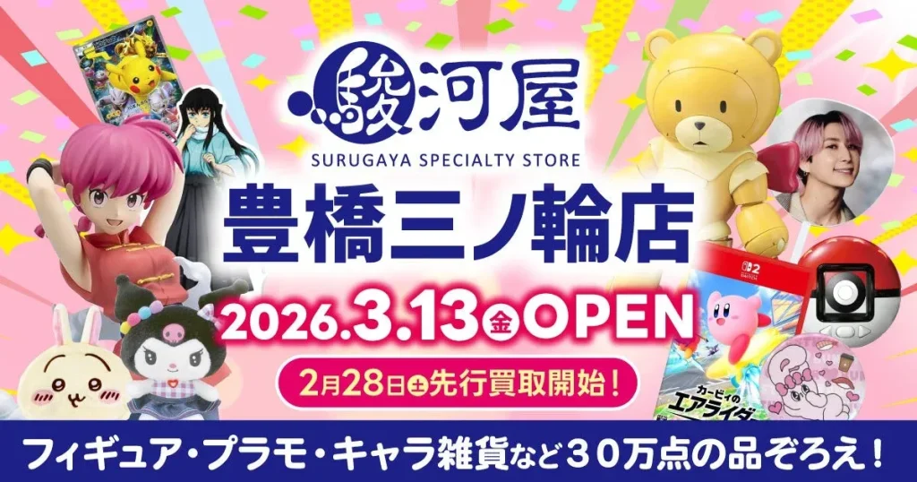 愛知県東三河エリアにホビーショップ「駿河屋 豊橋三ノ輪店」が2025年3月13日(金)にグランドオープンします。ファンシー雑貨やフィギュア、プラモデルなど30万点以上のアイテムを取り扱い、先行買取も実施されます。 -