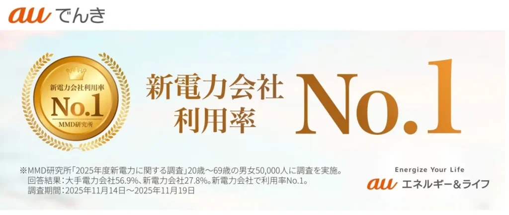 auエネルギー&ライフ株式会社が提供する「auでんき」が、MMD研究所の「2025年新電力に関する調査」において、利用している新電力会社で1位を獲得しました。その人気の理由やサービス内容、利用を検討する際のポイントを解説します。 -