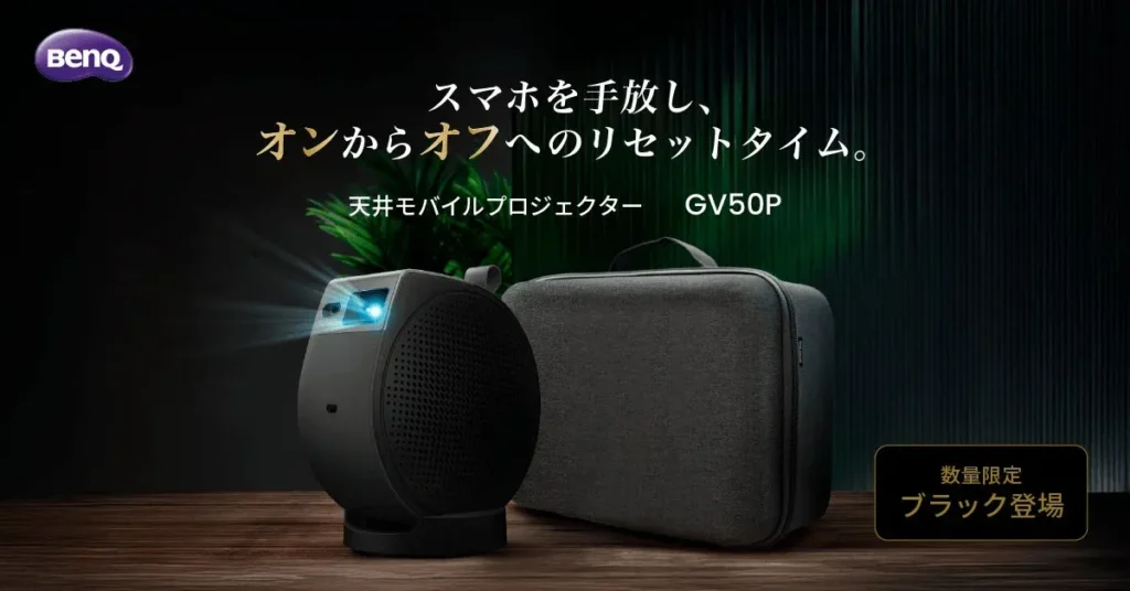 BenQの天井モバイルプロジェクター「GV50P」に新色ブラックが登場、11月30日より数量限定で発売
