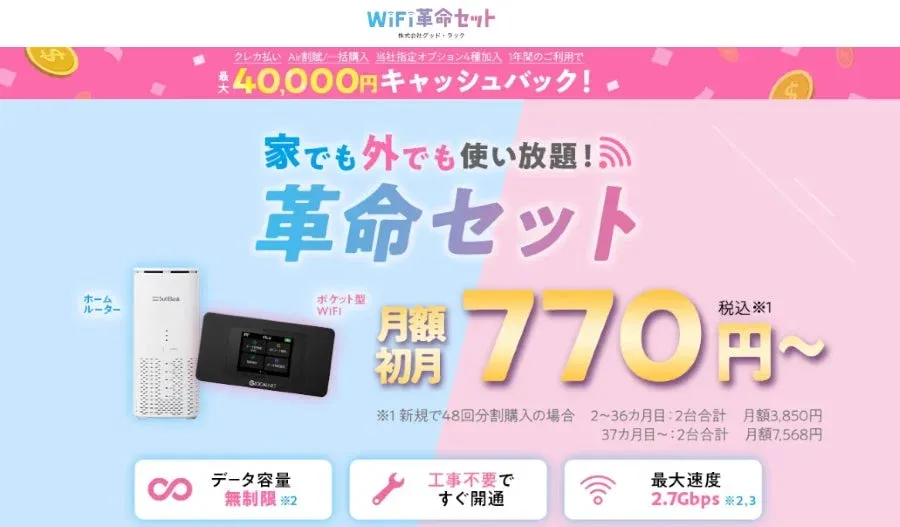 「WiFi革命セット」が最大40,000円キャッシュバックに増額!WiFiストア限定キャンペーン開始