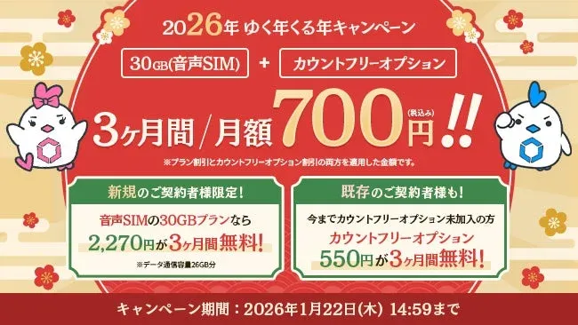 LinksMateが「2026年ゆく年くる年キャンペーン」を開催 – 音声SIM 30GB+カウントフリーが3ヶ月間月額700円に