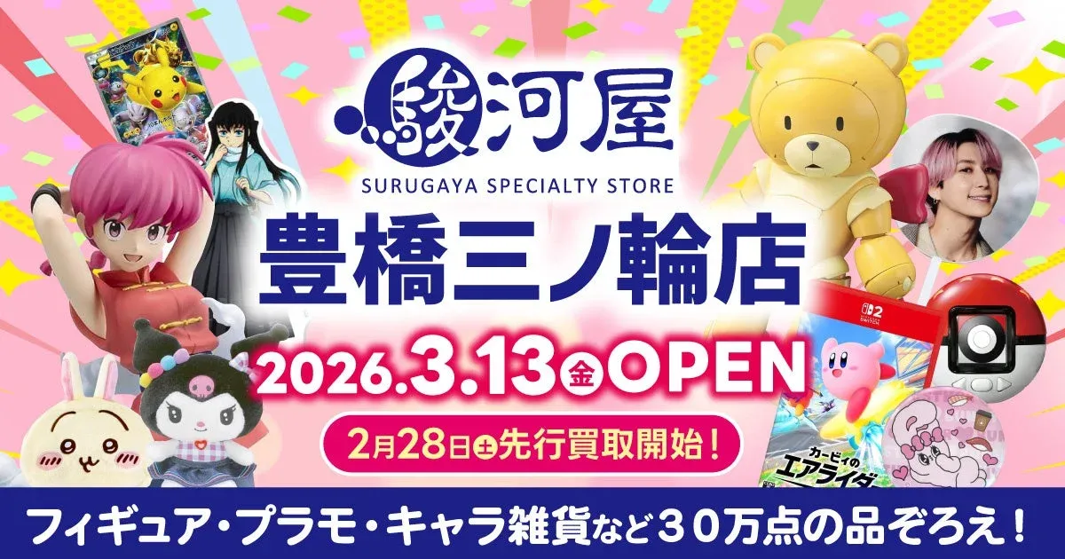 「駿河屋 豊橋三ノ輪店」は、豊鉄バス「本興寺東」バス停から徒歩約3分のTSUTAYA三ノ輪店内にオープンします。販売開始に先立ち、2025年2月28日(土)から先行買取がスタートし、3月13日(金)に販売も開始されグランドオープンを迎えます。