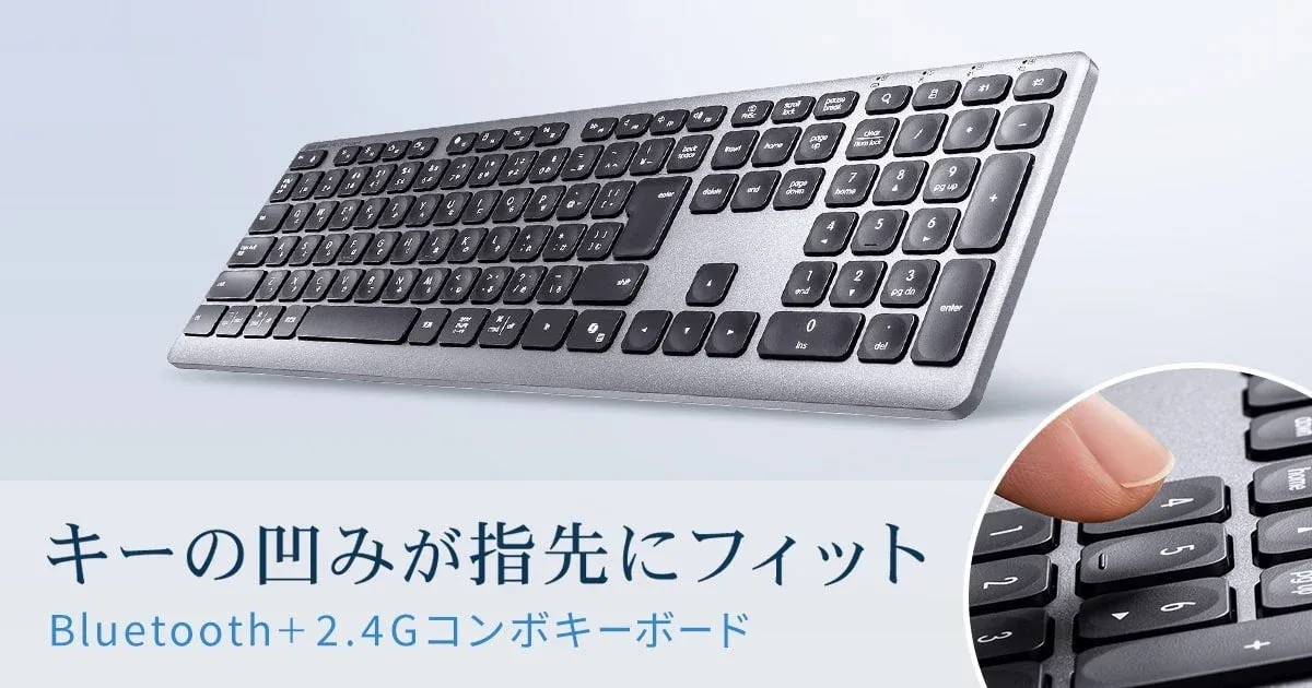 本製品はBluetoothと2.4GHzワイヤレスの両方に対応しており、パソコン、タブレット、スマートフォンなど最大3台の機器を登録し、キーを押すだけで簡単に切り替えて使用できます。これにより、複数のデバイスを同時に使用する環境でも、キーボード1台で効率的な作業が可能です。