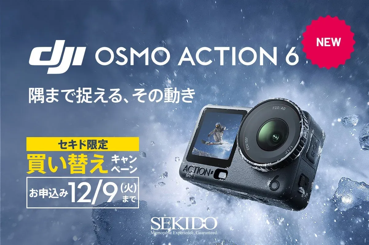 DJI Osmo Action 6の発売に合わせて、セキドではアクションカメラの下取りサービスが2025年12月9日(火)まで実施されています。このキャンペーンでは、故障して動かない製品や、セキド以外で購入した製品も下取りの対象となります。