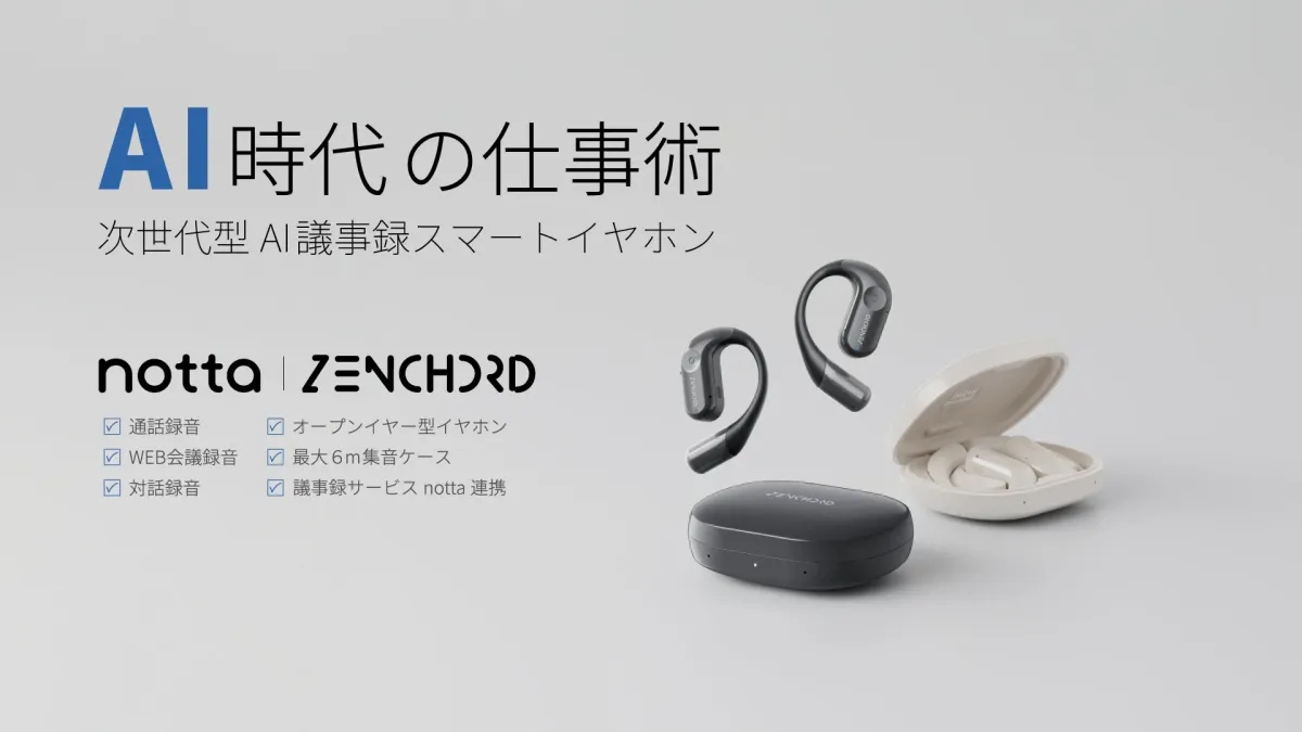 「Zenchord 1」は、累計1000万人以上が利用する音声認識ツール「Notta」のAI技術と「Zenchord」の音響技術を融合させた次世代AIイヤホンです。オンライン会議から電話中、PCを開けない場面での会話まで、仕事の中で発生する様々なコミュニケーションをハンズフリーで記録できる点が大きな特徴です。