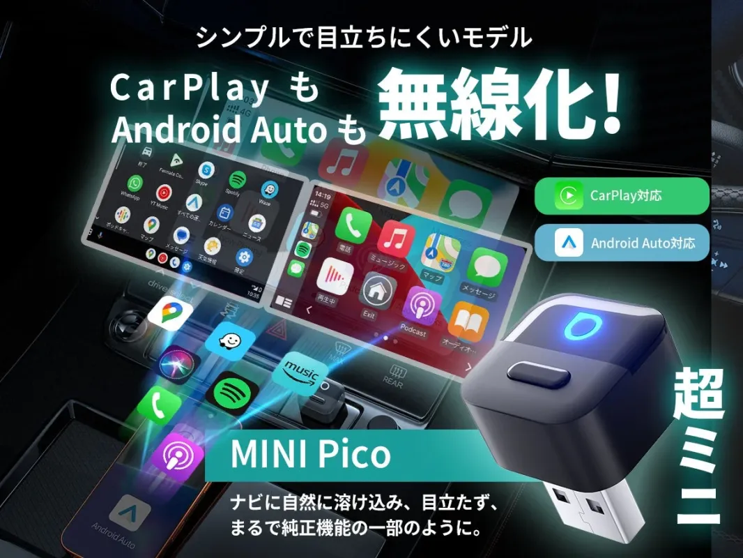 MINI Picoは、iOS 10以降、Android OS 11以降のスマートフォン(Samsung・Google製端末を含む一部機種)に対応しています。また、純正有線CarPlay/Android Autoを搭載したほぼすべての車種(約98%以上)で利用可能です。ただし、BMWおよびTeslaには非対応である点には注意が必要です。