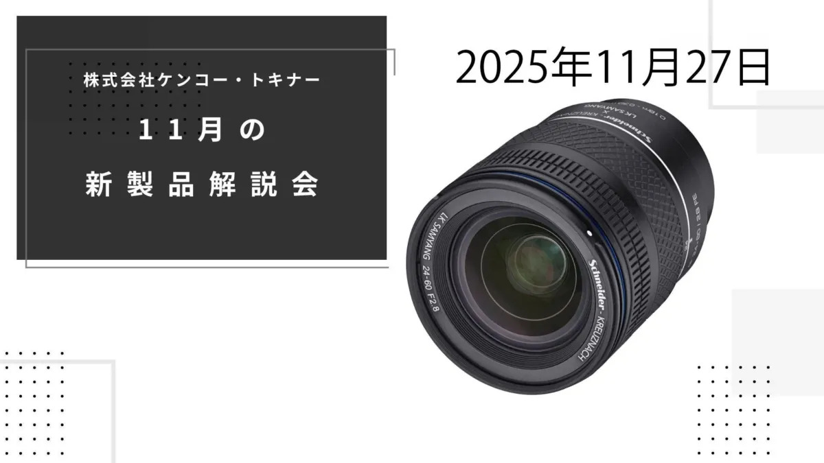 ケンコー・トキナーが開催した11月の新製品解説会では、SAMYANG AF 24-60mm F2.8 FEレンズやスリックバーチカルビデオヘッドなど、写真・映像愛好家にとって魅力的な製品が紹介されました。これらの製品は、撮影の幅を広げ、より豊かな表現を可能にするでしょう。気になる方は、ケンコー・トキナーの公式サイトで詳細をご確認ください。