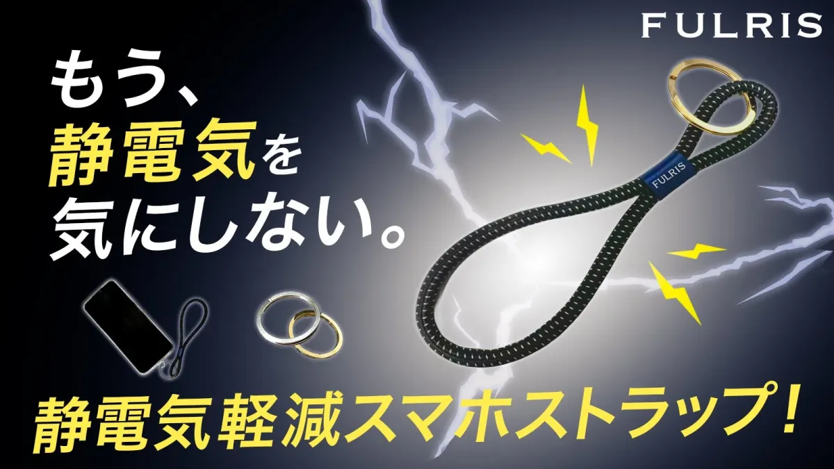 静電気を軽減する「FULRIS」ブランドのスマホストラップを紹介する画像